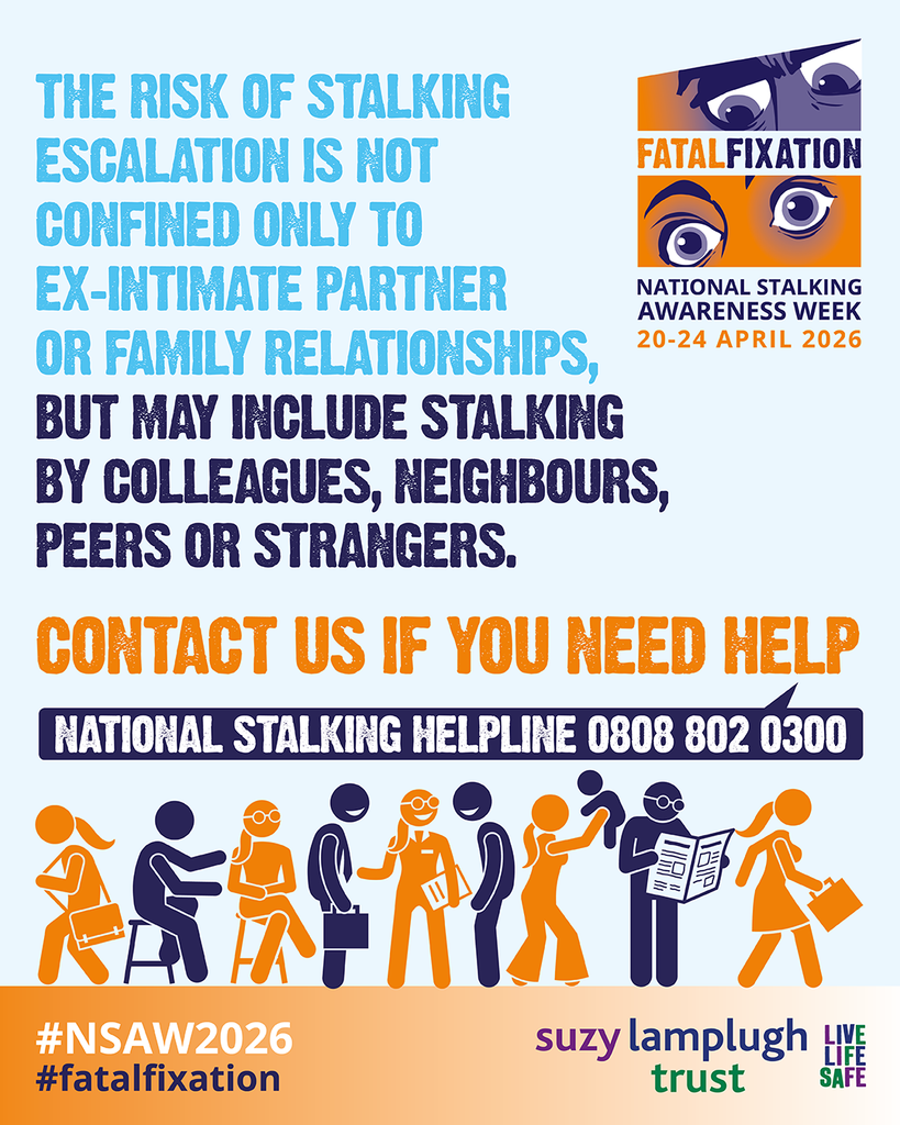 National Stalking Awareness Week 2026 takes place from 20-26 April. This year the Suzy Lamplugh Trust is highlighting the critical link between stalking and homicide, reinforcing the importance of early recognition and effective responses across all services.